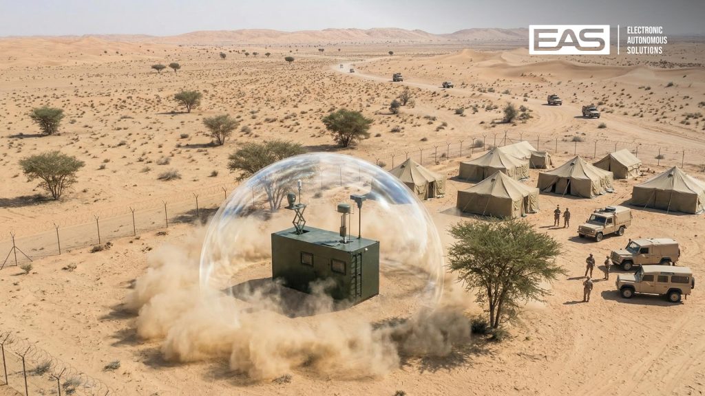 EAS DOME Stationary — the fixed-site variant of the flagship platform in a ruggedized containerized configuration. Designed for continuous 24/7 monitoring and protection of strategic facilities.
